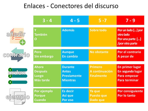 Para la expresión escrita, los ejemplos de conjunciones (conectores o palabras de enlace) son imprescindibles. Además, y como complemento a los ejemplos de gramática (normalmente tiempos verbales) siempre recomiendo tener a mano la lista de los principales verbos en infinitivo. Además, para los estudiantes con experiencia en esta práctica, recomiendo tener una lista de los adjetivos más utilizados, que aportaran puntos extra a sus frases y textos.